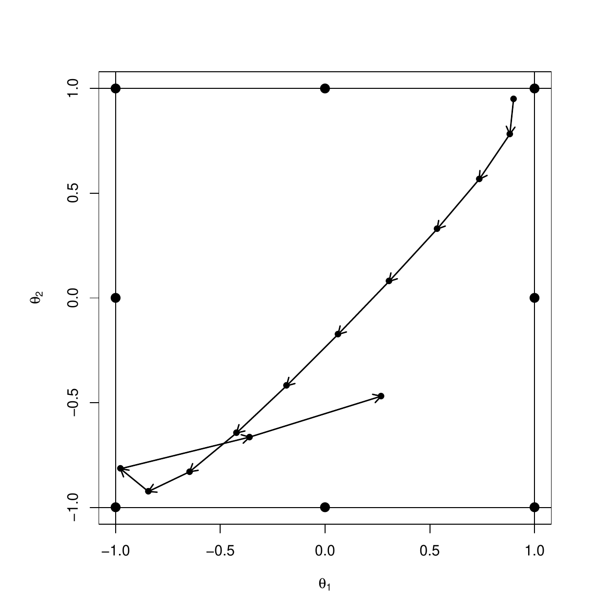 R> plot(q, xlab = expression(theta[1]), ylab = expression(theta[2]),